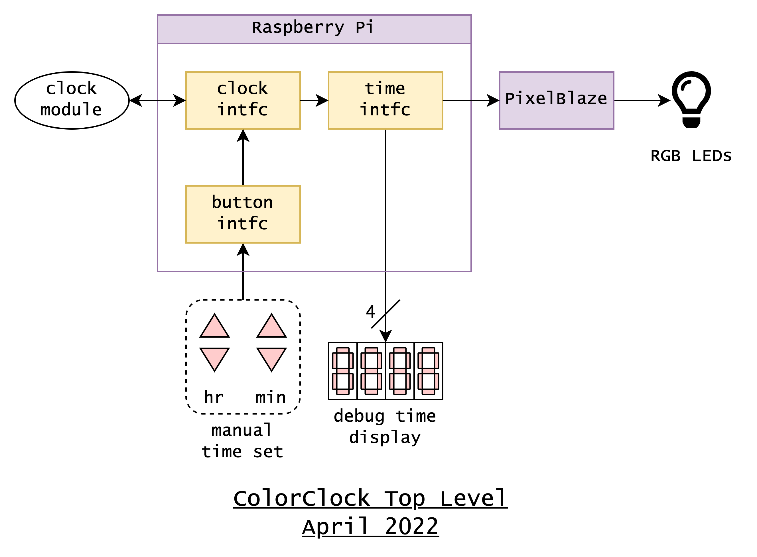 The manual time set is a cluster of 4 buttons that allow the developer / artist to set the time manually. These buttons can also potentially be used to interface with the piece in additional ways, e.g. change the color profile, change cycle time.