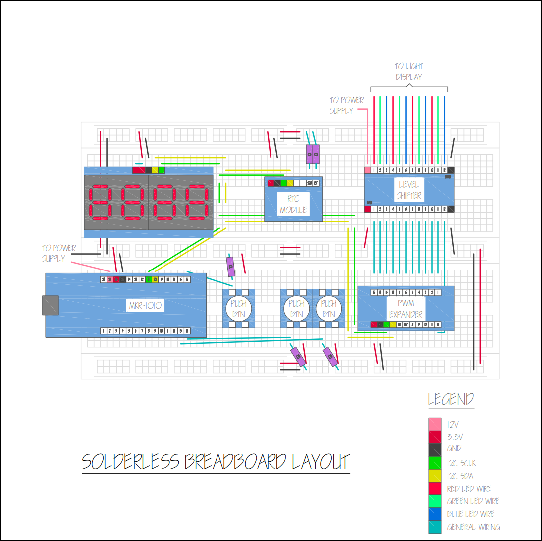 ColorClock has four light strips and three variable voltage lines per strip (one for each red, green and blue) so I need exactly 12 PWM pins. According to the product page for the MKR 1010, there are supposed to be 13 PWM pins on the board BUT one of those listed pins would be unusable for variable voltage output on ColorClock because it needed to be used for the I2C SCL required for communication to the various modules.