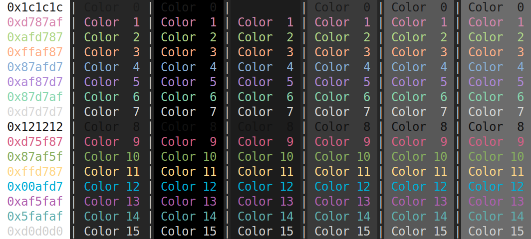 { "intense-bold" : "false" , "background-color" : "0x262626" , "background-color-intense" : "0x303030" , "foreground-color" : "0xc6c6c6" , "foreground-color-intense" : "0xafafaf" , "cursor-color" : "0xff875f" , "palette" : [ "0x1c1c1c" // Color 0: Black , "0xd787af" // Color 1: Red , "0xafd787" // Color 2: Green , "0xffaf87" // Color 3: Yellow , "0x87afd7" // Color 4: Blue , "0xaf87d7" // Color 5: Magenta , "0x87d7af" // Color 6: Cyan , "0xd7d7d7" // Color 7: White , "0x121212" // Color 8: Bright black , "0xd75f87" // Color 9: Bright red , "0x87af5f" // Color 10: Bright green , "0xffd787" // Color 11: Bright yellow , "0x00afd7" // Color 12: Bright blue , "0xaf5faf" // Color 13: Bright magenta , "0x5fafaf" // Color 14: Bright cyan , "0xd0d0d0" // Color 15: Bright white ] }Run the script using the required arguments. To view the most up-to-date options and usage instructions, use the help flag: