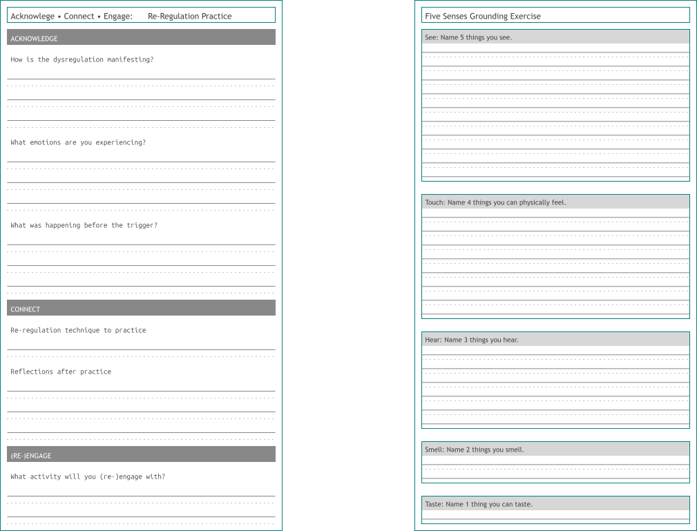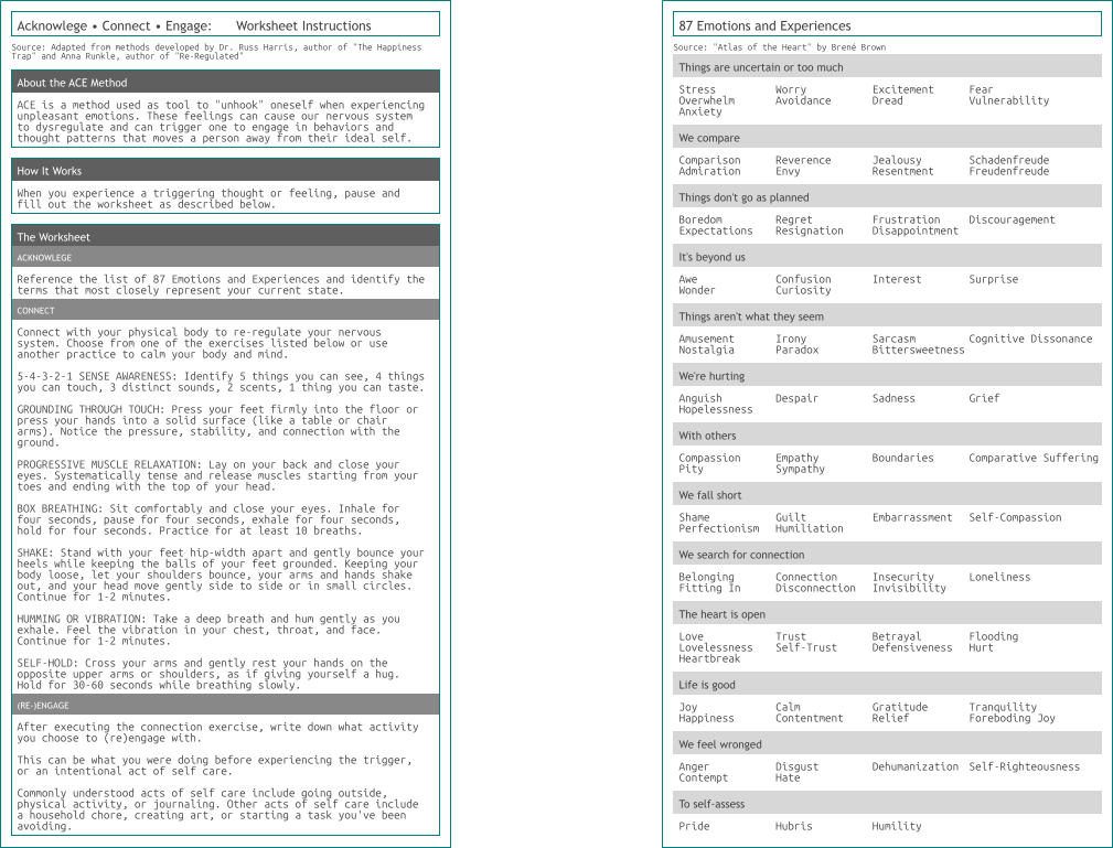 Thoughts and emotions can sometimes interfere with daily life and pull us away from our goals. ACE stands for Accept, Connect, and Re-Engage. It is a simple exercise that helps reduce the intensity of uncomfortable emotions and the dysregulation they can cause. This model is inspired by the work of Russ Harris and Anna Runkle. Use these pages whenever you feel your nervous system is becoming dysregulated.