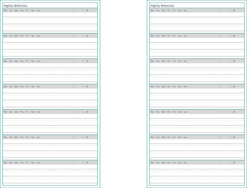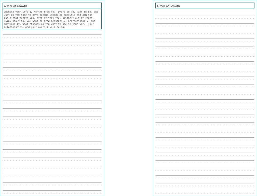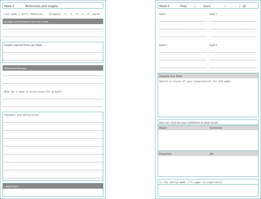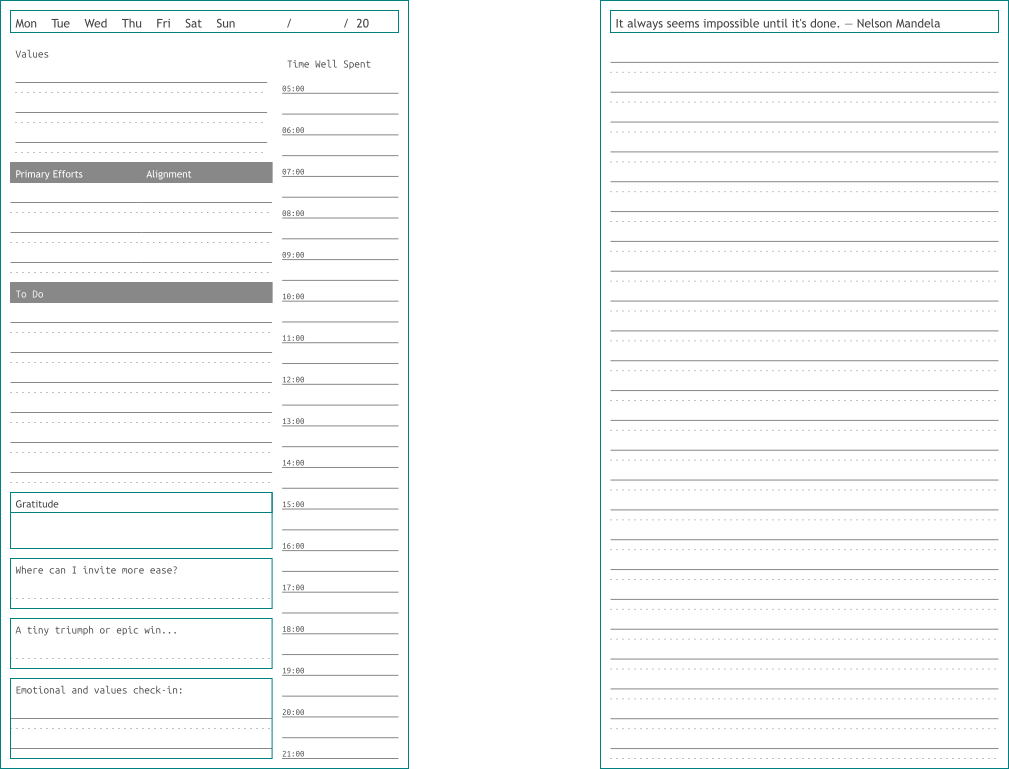 The weekly and daily logs are the core of the planner. Reflect weekly, plan ahead with your goals in mind, and use each day to restate your values, set priorities, and check in with your emotional state.