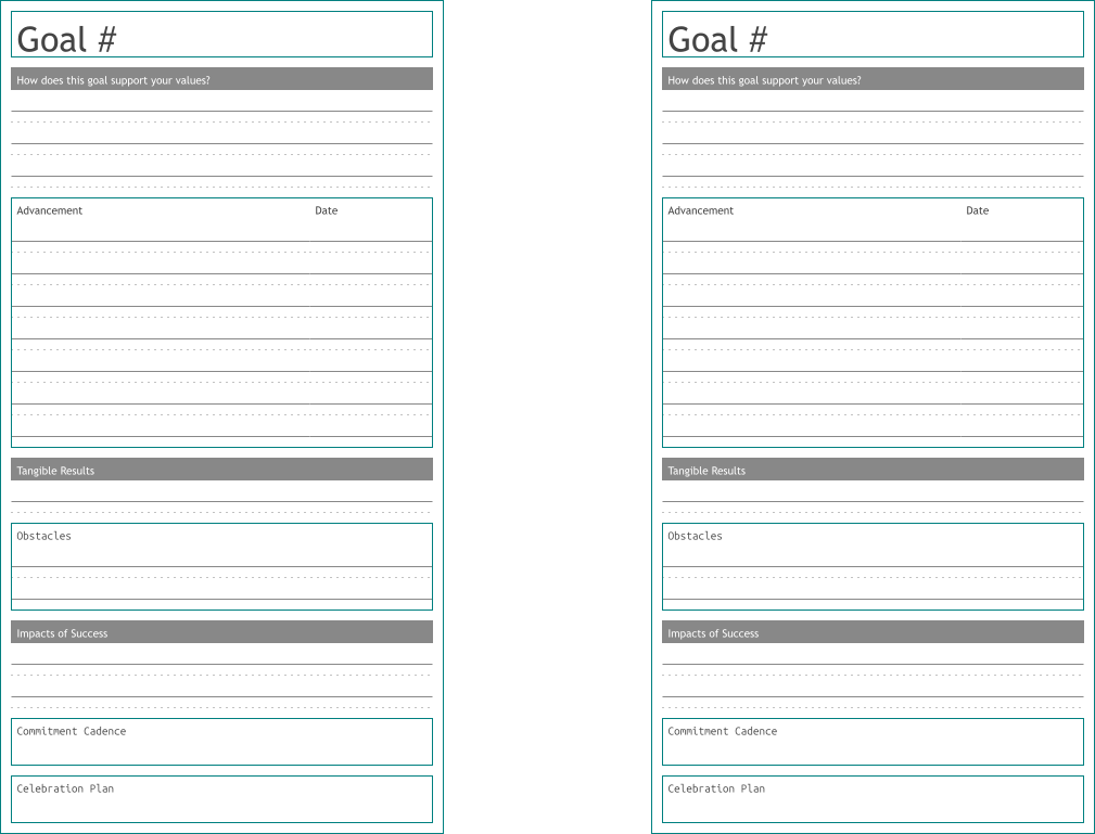 After completing your responses to your vision, set up to four bold yet realistic goals for the quarter. How can you break down that goal into smaller targets? What are tangible outcomes of reaching the goal? What obstacles to follow through can you anticipate? How often can you commit to working on that goal? How will you celebrate?