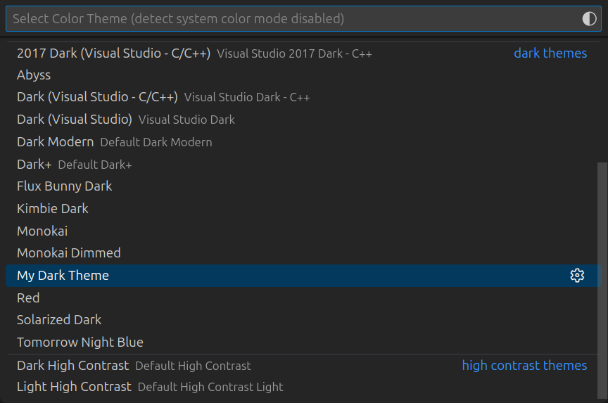 ~/.vscode/extensions/my-color-themesinclude the files formy-dark-theme.jsonandmy-light-theme.json.