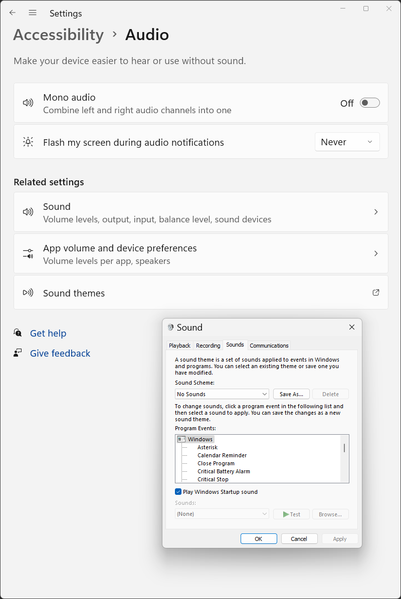 In the window labeled Sound -> tab labeled Sounds select the menu option No Sounds