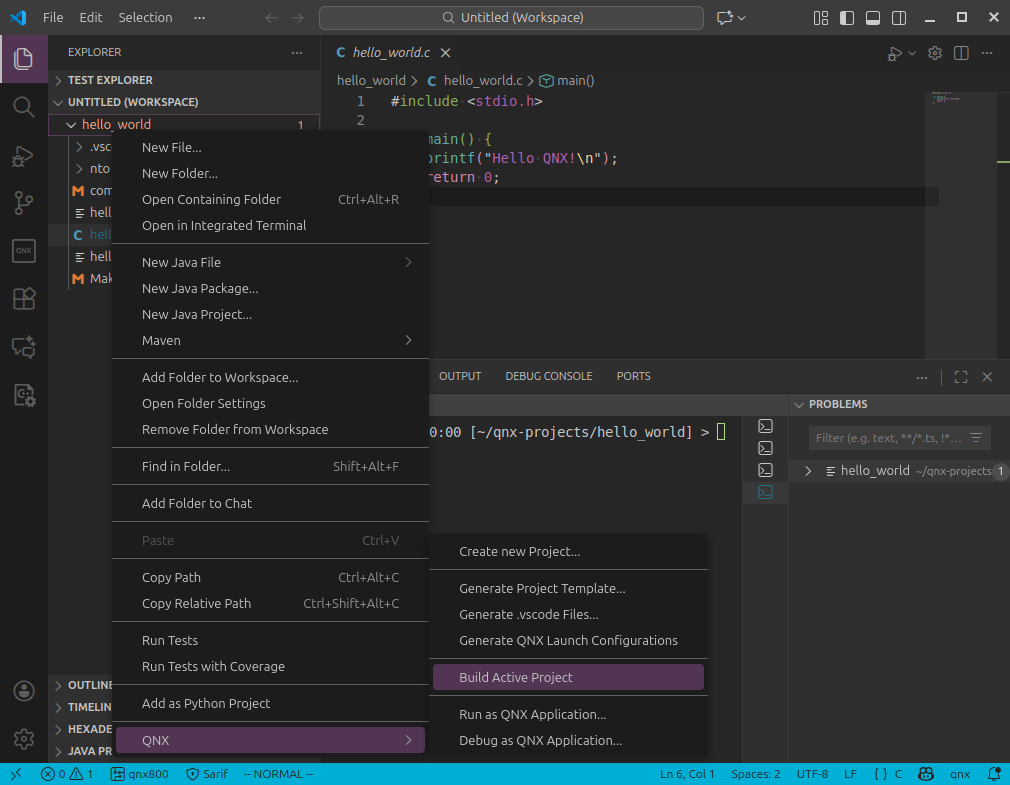 Hello Worldprogram is added tohello_world.c#include <stdio.h> int main() { printf("Hello QNX!\n"); return 0; }To compile, right-click on the project folder and go to