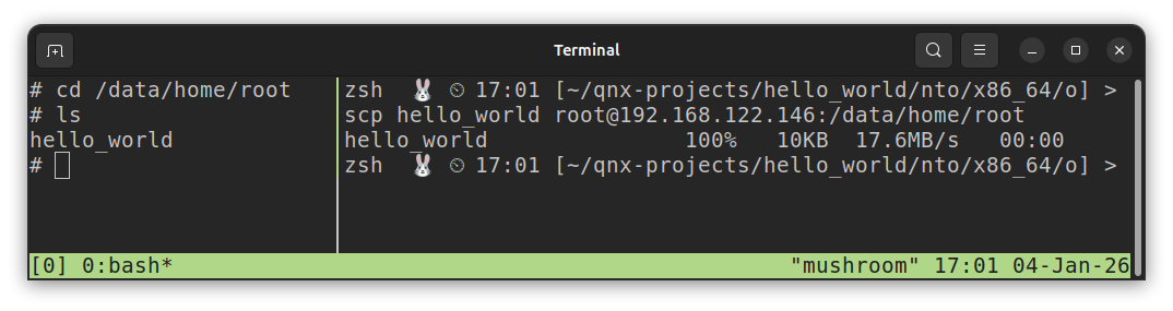 /data/home/rootand executels. You should see yourhello_worldexecutable.In this screenshot, the left pane is the running target, and the right pane is the Linux host computer.