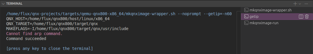 mkqnximage. Make sure to include the--ssh-identparameter.To run the virtual target in the terminal, from the directory where the target was created, execute this command: