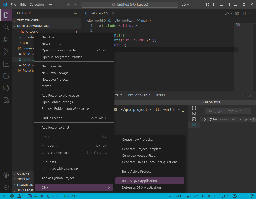 Hello Worldprogram is added tohello_world.c#include <stdio.h> int main() { printf("Hello QNX!\n"); return 0; }To compile, right-click on the project folder and go to