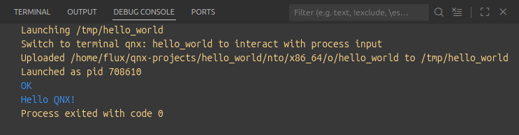 (linux host): cd ~/qnx-projects/hello_world/nto/x86_64/o # Navigate to output directory (linux host): ls # List contents of directory hello_world hello_world.dep hello_world.o MakefileFrom the Linux host, use